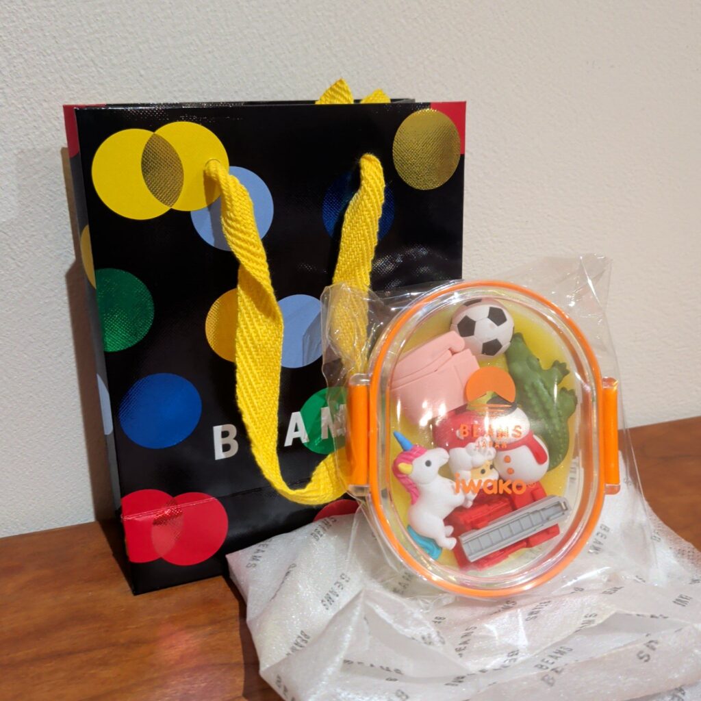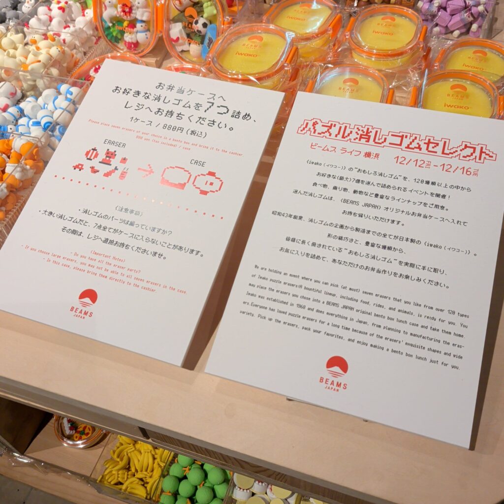 BEAMSオリジナル弁当箱にイワコーの面白消しゴムを7つ詰めて購入できるといったもの。